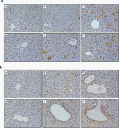 图2、cccDNA注射后小鼠肝组织中HBcAg(a)、HBsAg(b)的表达情况